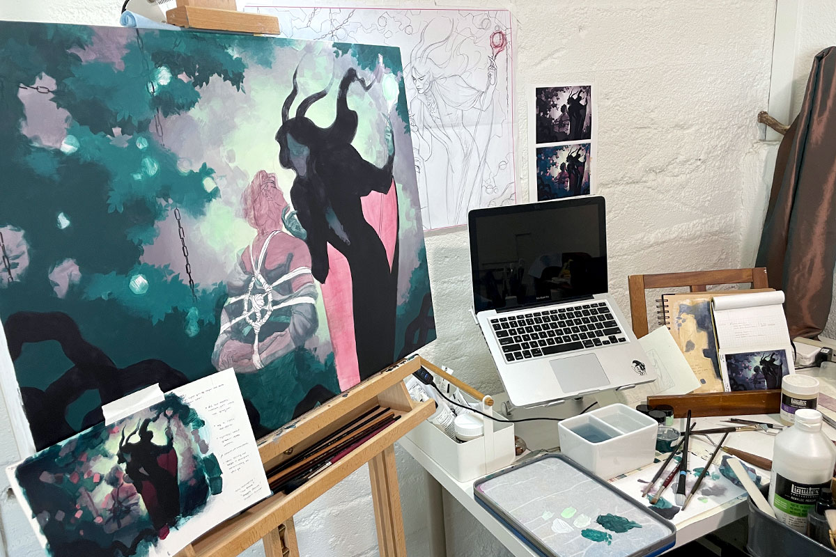 “The Thrall” was completed in a flurry of deadlines last summer over a series of long nights. Shortly after handing over the painting and the opening of the show, I hopped on a plane for an international trip and forgot about all the process photos and notes I had diligently taken while painting. Luckily, I found…